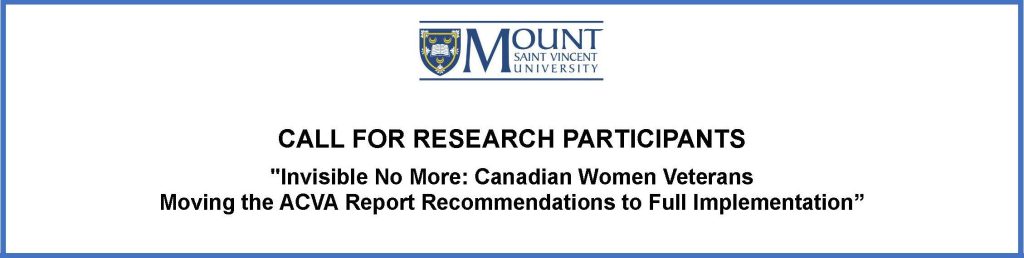 The Invisible No More Project Team at Mount Saint Vincent University is recruiting women Veterans for their study on the implementation of the recommendations of the landmark ACVA report. If you testified or submitted a brief for the ACVA study on the Experience of Women Veterans, you may be eligible to participate. You may also be eligible to participate if you wanted to testify but did not have the opportunity to, or if you were asked to testify but declined.