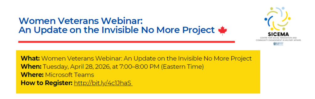 Join us on Tuesday, April 28, 2026, at 7:00-8:00 PM (Eastern Time), for a webinar about the Invisible No More Project and how it is helping move the 42 recommendations from Parliament’s 2024 Invisible No More. The Experiences of Canadian Women Veterans report into action. To join the webinar, please register here: http://bit.ly/4c1JhaS
