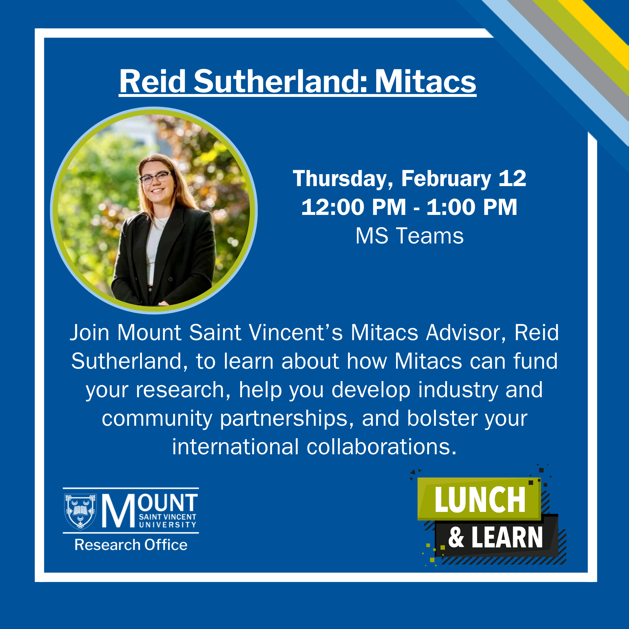 SAVE THE DATE! The MSVU Research Office Lunch & Learn invites you to join us to learn about Mitacs with Reid Sutherland on Thursday, February 12th 2026, from 12:00 pm – 1:00 pm.